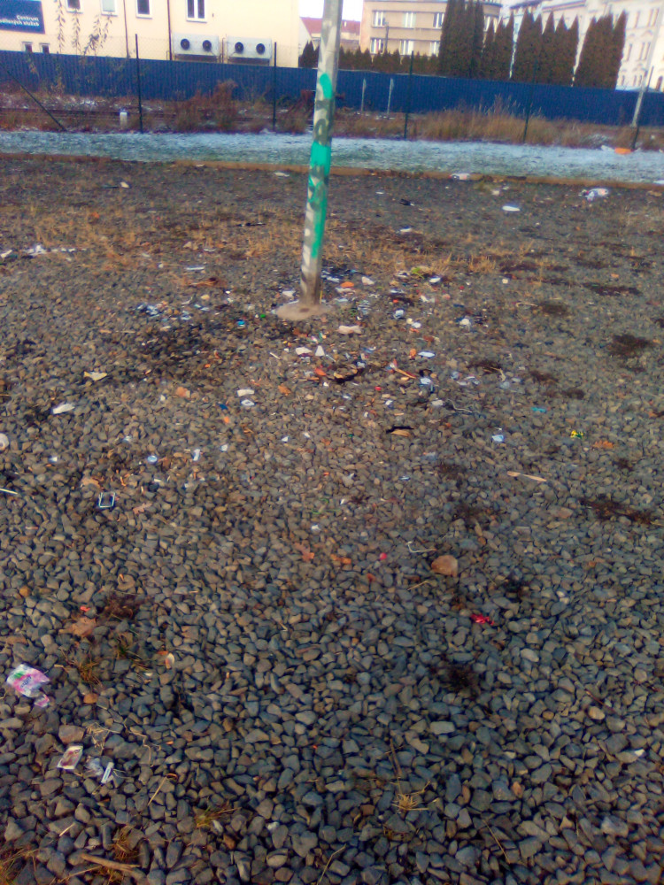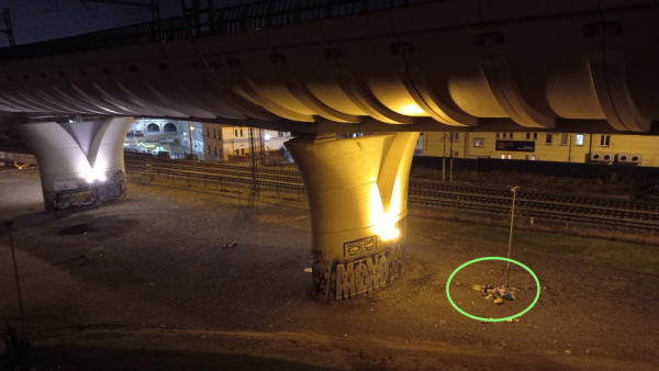 U třetího pilíře železničního mostu Nové spojení se nachází okolo zde stojícího sloupu lampy poházený odpad, označený zeleně.