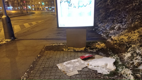 V ulici Pod Krejcárkem se u reklamní vitríny vedle lampy VO číslo 302 140 nachází pár pohozených kartonů a nějaký světlomet.