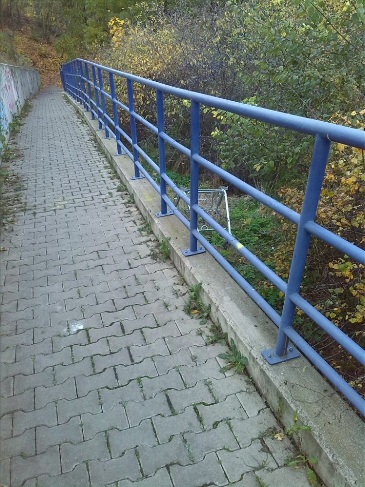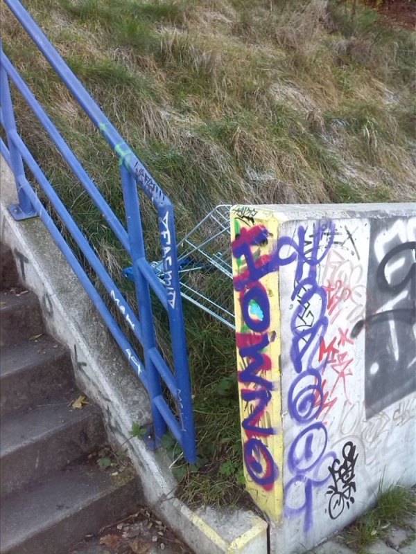 Nákupní košík, hlášený zhruba před týdnem, byl jen zdánlivě uklizen vojáky. Někdo ho našel schovaný v roští a rozdělal na dvě části. Válejí se od sebe nedaleko. Myslím, že bez vašeho zásahu tam zůstane navěky. Přikládám foto.