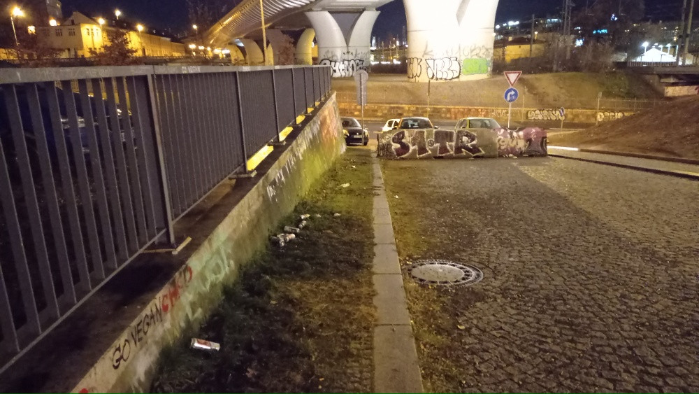 Na cestě vedoucí z ulice Trocnovská se pod opěrnou zdí nachází poházené odpadky, zejména plechovky.