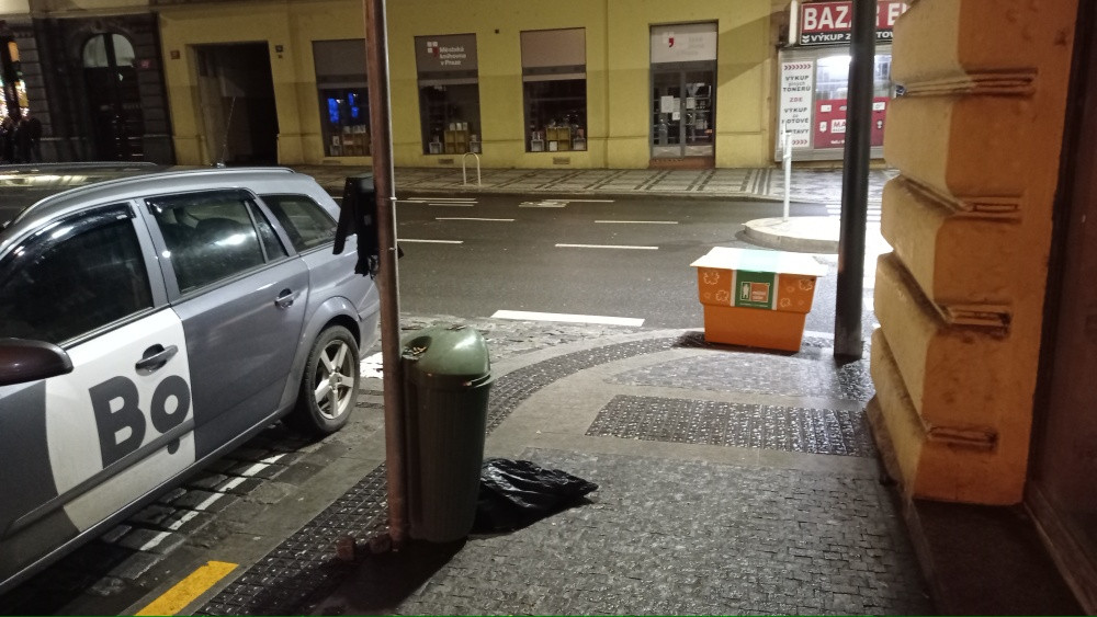 U odpadkového koše v ul. U Božích bojovníků se nachází odložený pytel s odpadky.