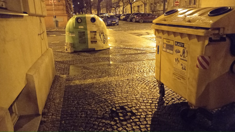Díra v dlažbě chodníku na rohu Roháčova Domažlická u hnízda kontejnerů na tříděný odpad číslo 03/098.
