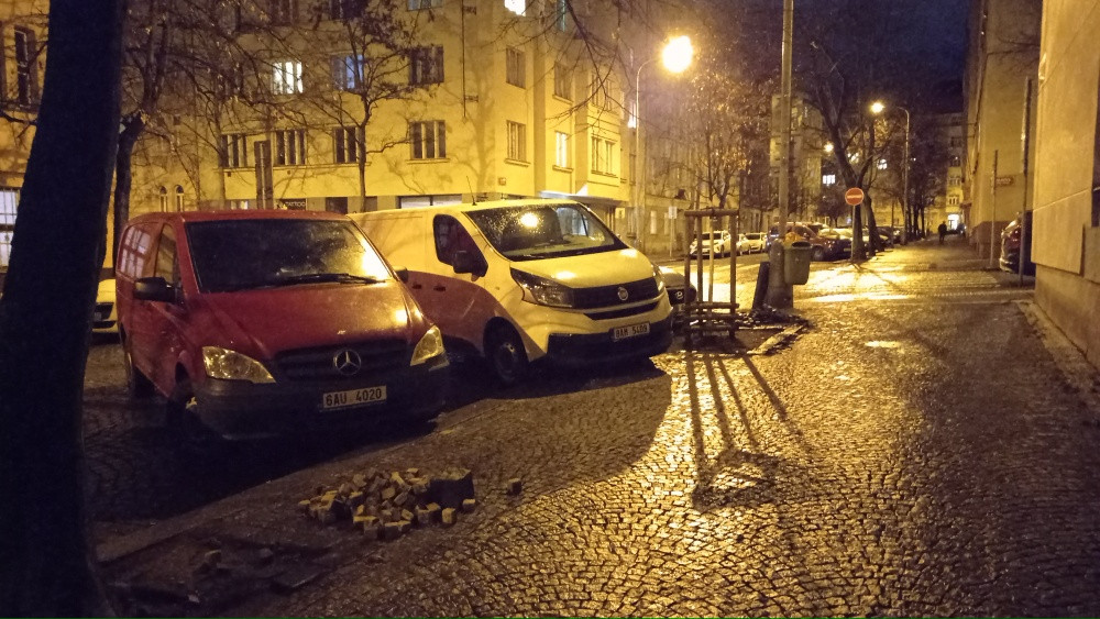 Hromádka přebytečných dlažebních kostek u druhého stromu v ulici Roháčova od křižovatky s ulicí Hájkova.