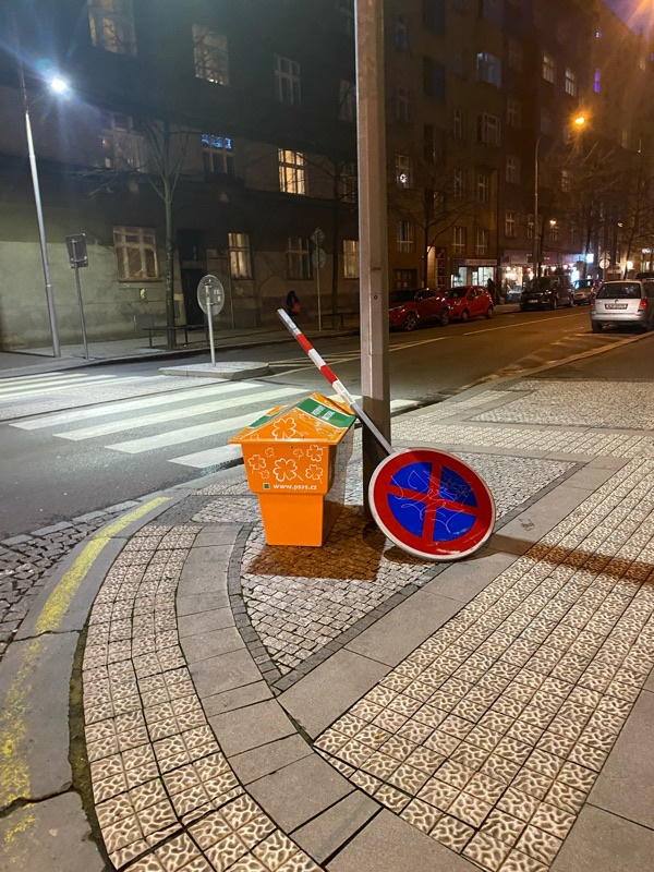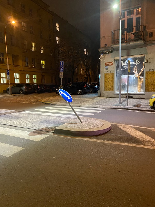 Dobry den, u křižovatky Ondříčkova, Laubova a Blodkova jsou zničené dopravní značky.