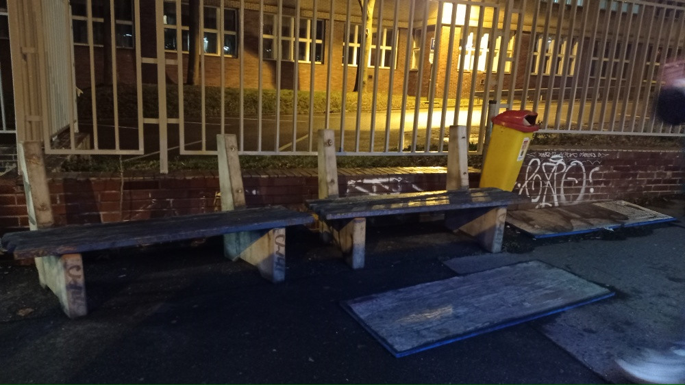 Na autobusové zastávce Náměstí Winstona Churchilla linky 135 směr Florenc se nachází dvojice poškozených velkých reklamních laviček.
