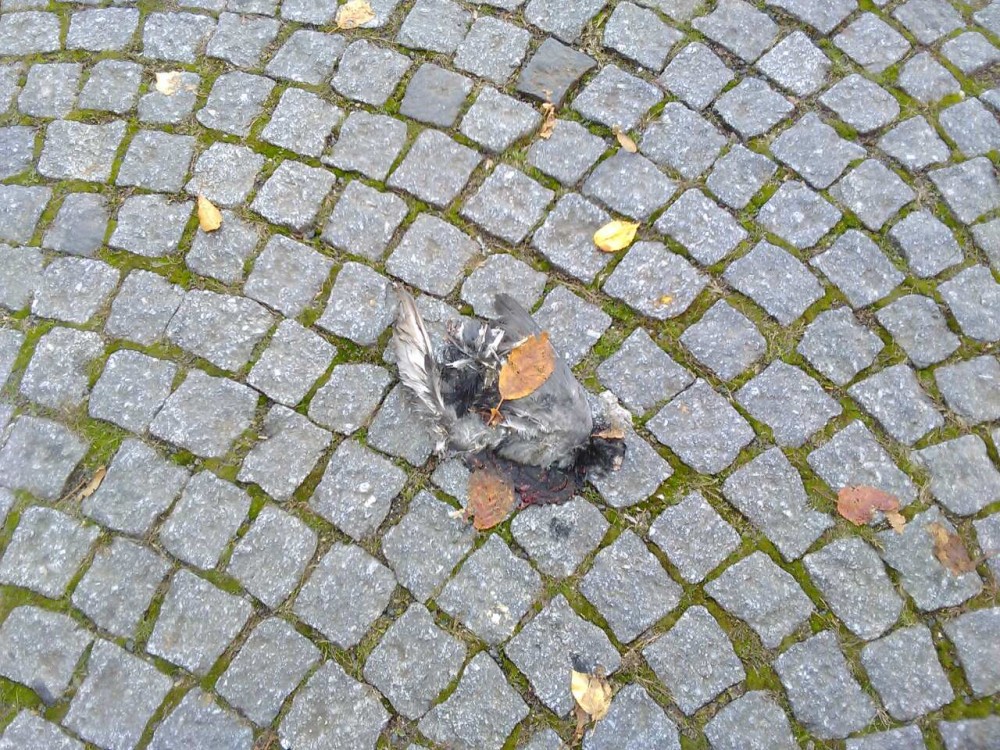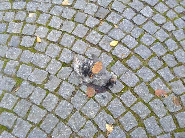 Mrtvý holub na placičku uprostřed ulice.