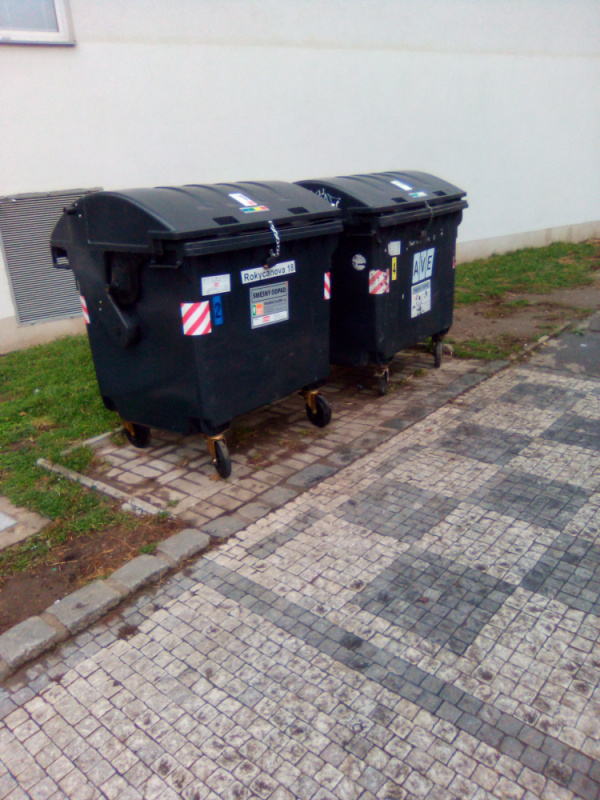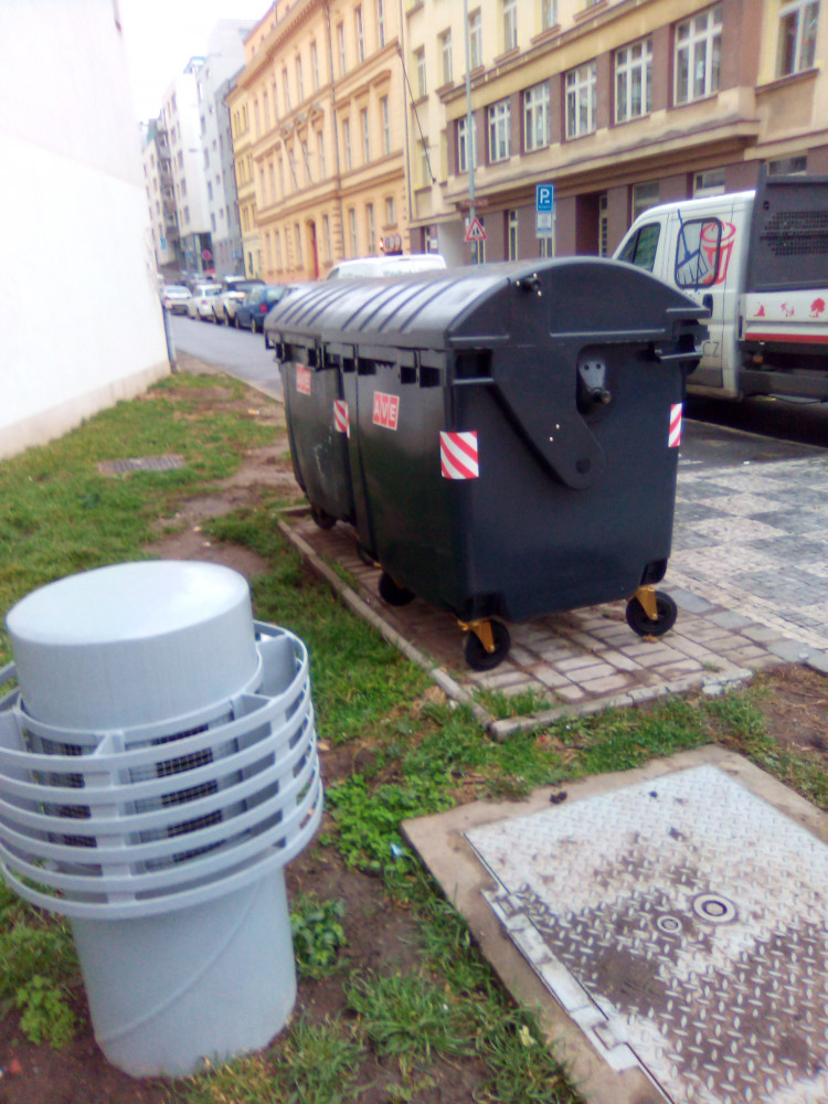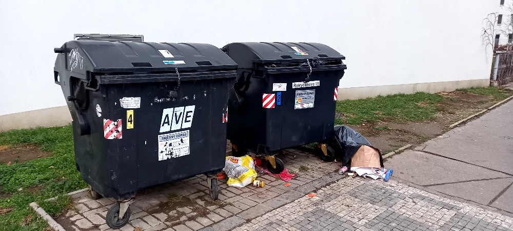 Vyházené koše, za nimi starý chléb na kterém se hostí holuby a krysy. Na chodníku před koši přebalovací podložky od exkrementů.