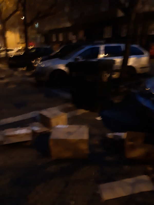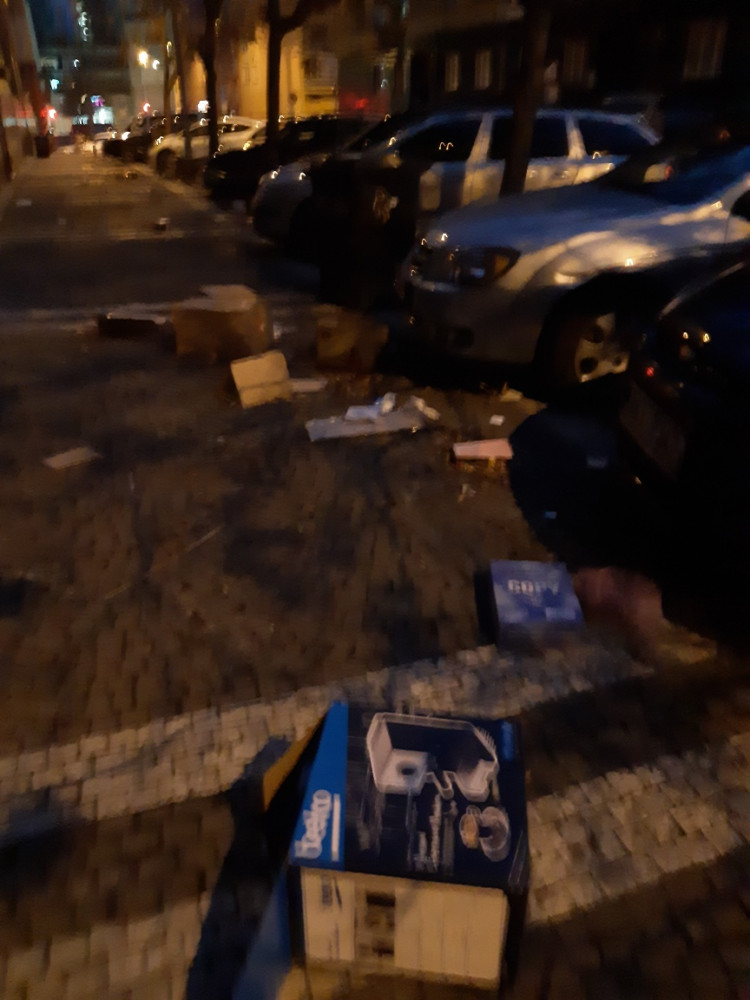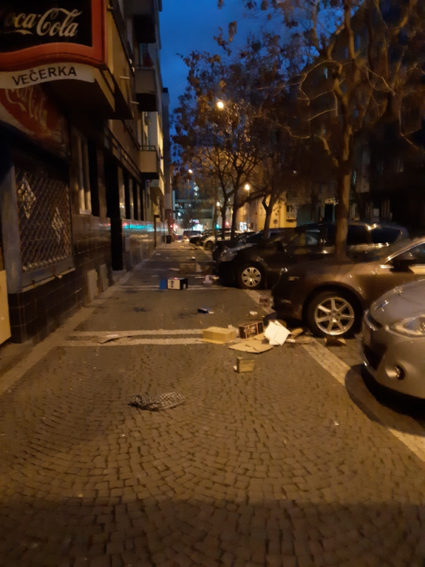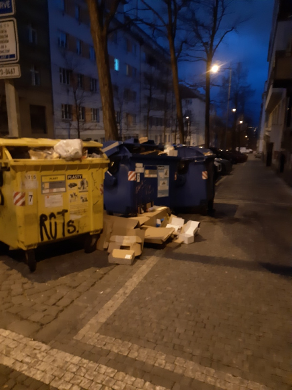 Rozfoukaný papír ko ulice kolem kontejnerů a do ulice premyslovska. jako obvykle kontejnery brani přecházení chodců.