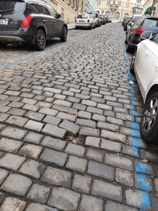 díra ve vozovce, chybějící dlažební kostka. nad přechodem pro chodce u rohu s ulicí Seifertova