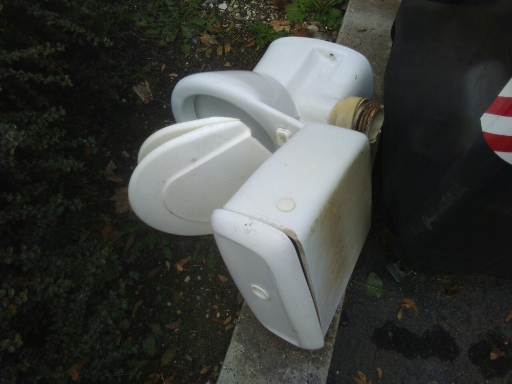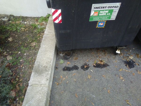 Starý vysloužilý záchod tajně odložený v koutě: vpravo vedle vjezdu na parkoviště, u tří šedivých kontejnerů na směsný odpad.