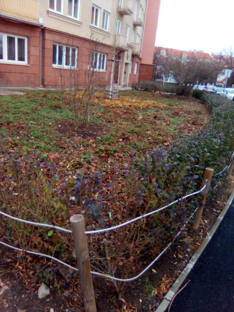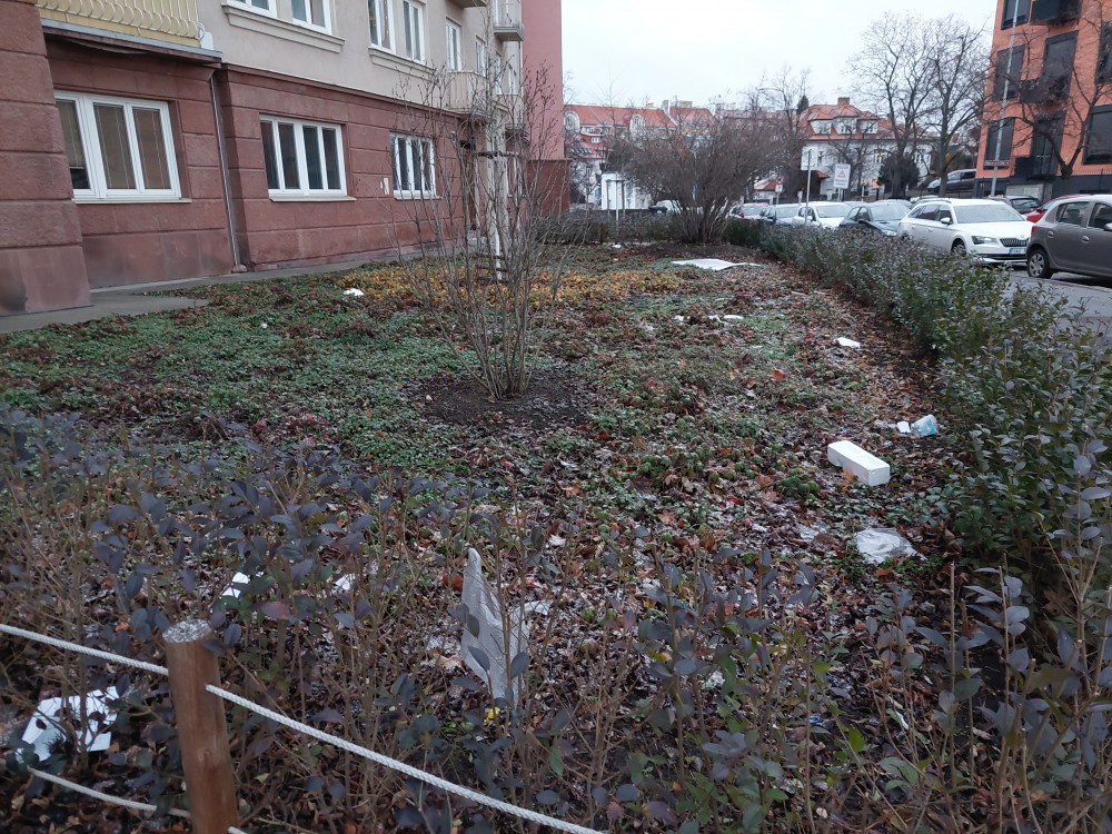 Rozfoukané odpadky v předzahrádkách před domy Malešická 31 až Ambrožova 3. Prosím o úklid.
