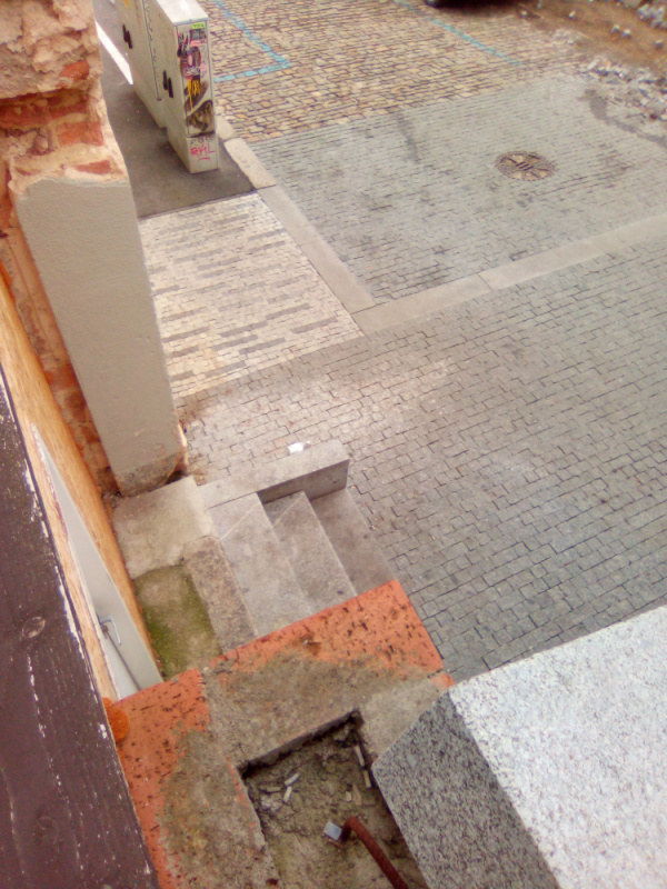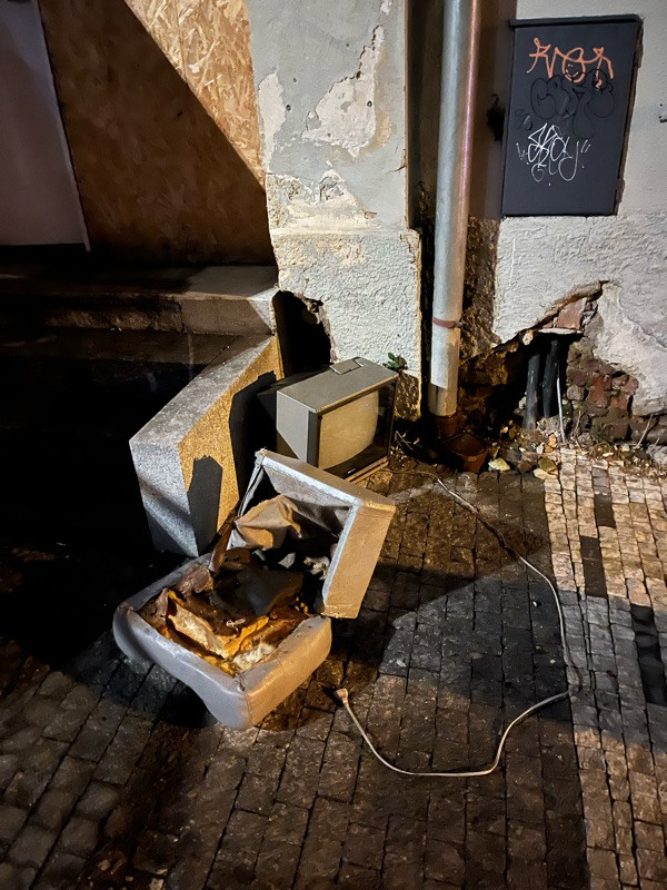 Televize a kus nabytku na ulici vedle schodu na cyklostezku.