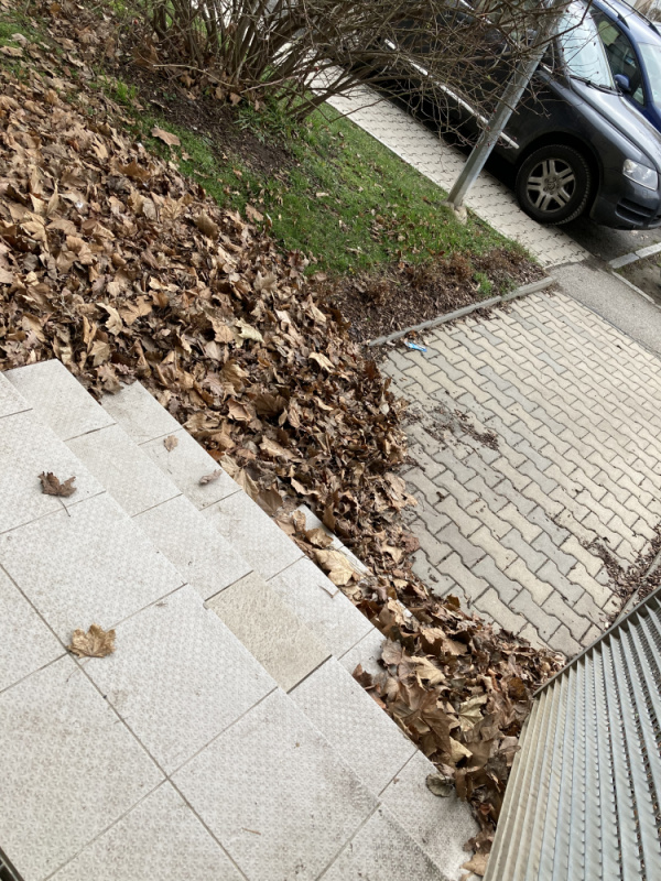 U hlavního vchodu do baráku K Chmelnici 2494/7 P3 naváté větrem spoustu listí.