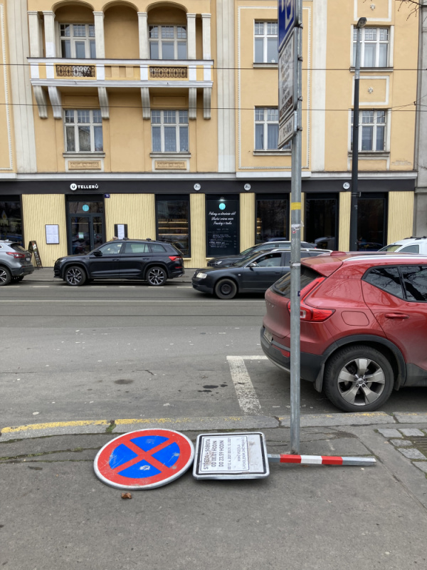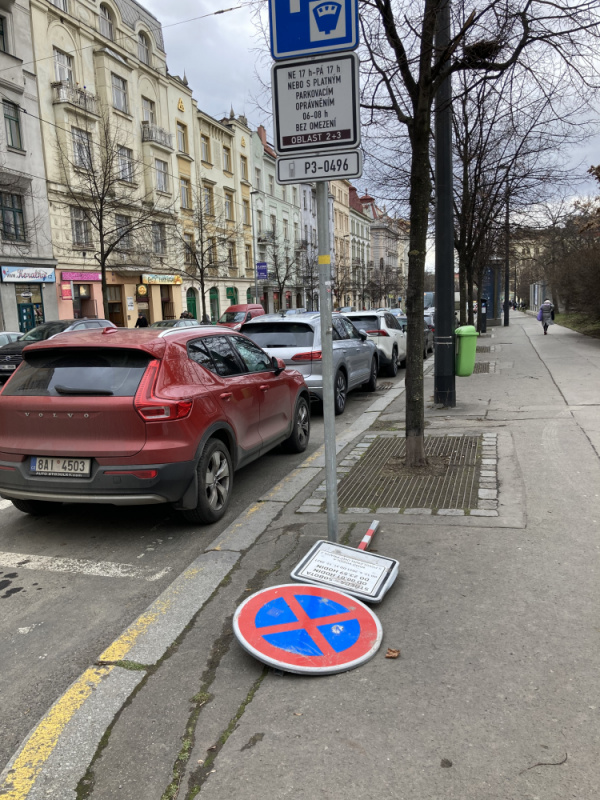 Ležící dopravní značení s prošlým datem do 31.12.2021 na rohu nám. Jiřího z Poděbrad.
