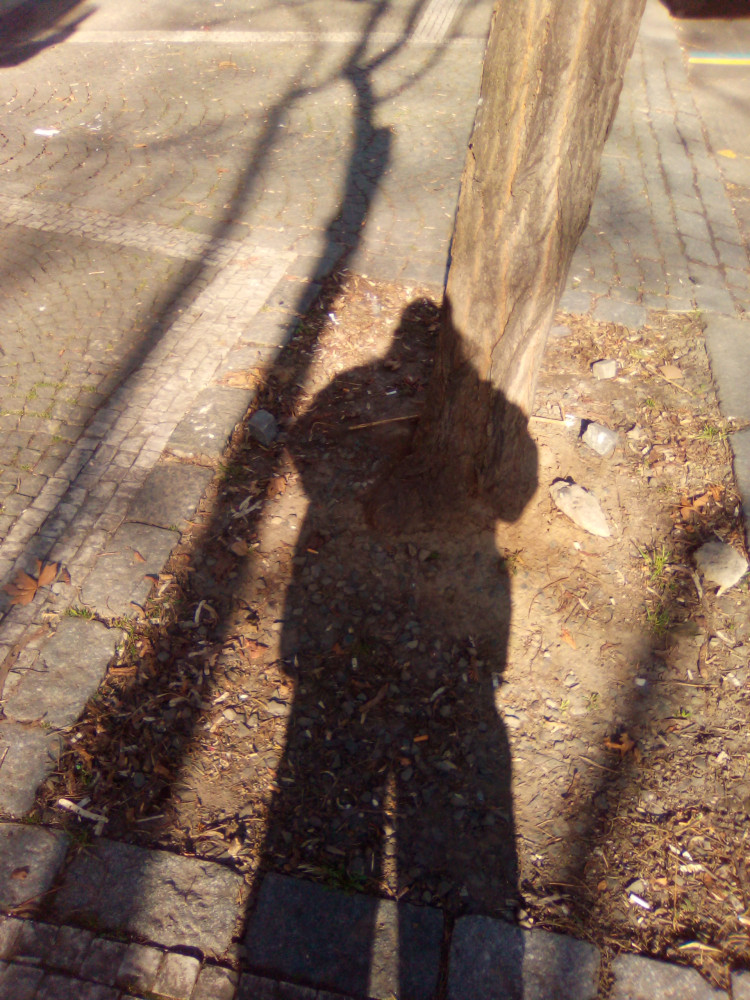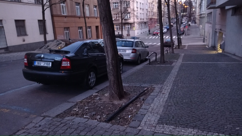 V rabátku se stromem vedle lampy číslo 301 685 leží pohozená černá trubka.
