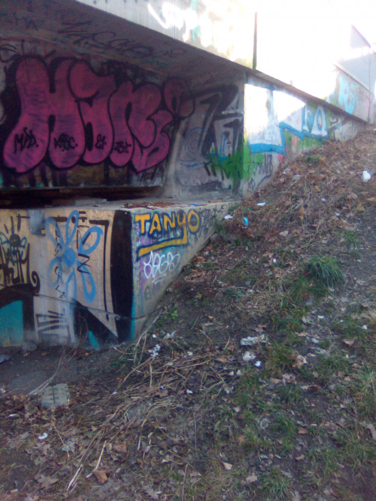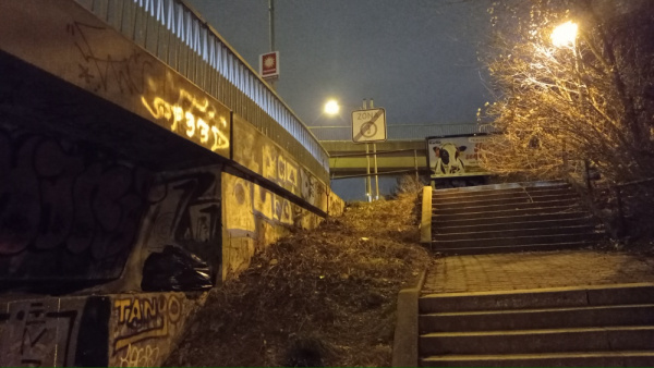 Pod silničním mostem naproti lampě číslo 302 145 leží pohozeny pytel odpadků.