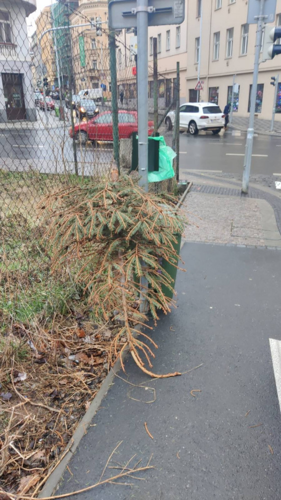 Vánoční stromek na chodníku v ulici Pod Vítkovem. Nejde tam projet kočárkem. Nechápu, proč je tam lidi nechávají, v lednu jsem odtamtud už jeden odnášela. Teď spěchám na vlak. A mám kočárek. Šlo by to, prosím, uklidit? Obecně je ta ulice vždycky hrozně zaneřáděná, lidi jsou jak zvířata