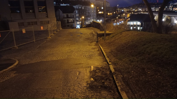 Naproti vchodu do armádního muzea se u lampy číslo 300 411 nachází zanesená vpusť kanalizace.