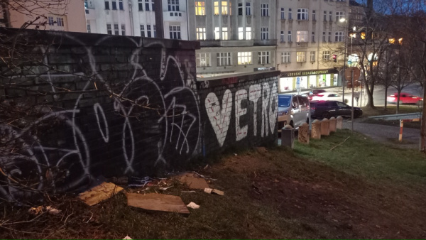 Za zdí u ulice U Památníku se nachází na úrovni lampy 300 407 hromádka odpadků.