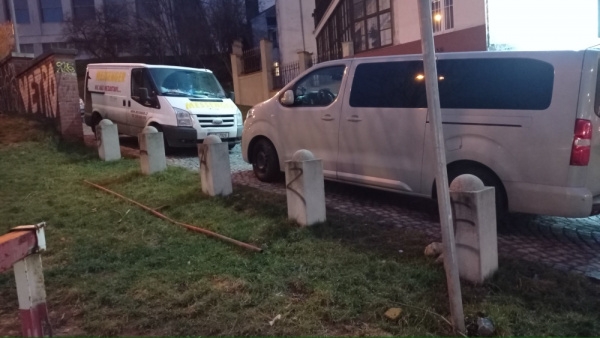 Na trávníku u ulice U Památníku se nachází pohozený kus kovové trubky, bývalého nízkého zábradlí.