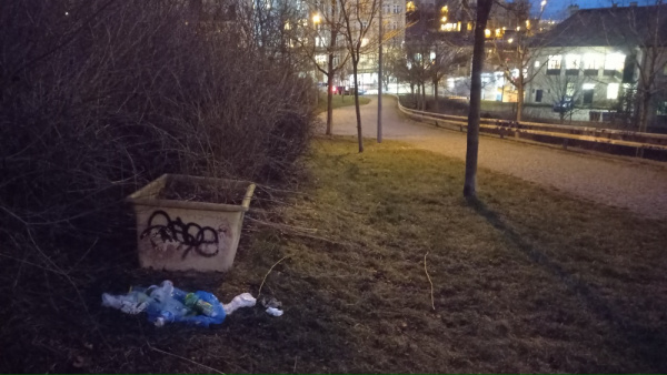 U ulice U Památníku se nachází vedle rozbitého, zarostlého zásobníku na posypový materiál poházené odpadky.
