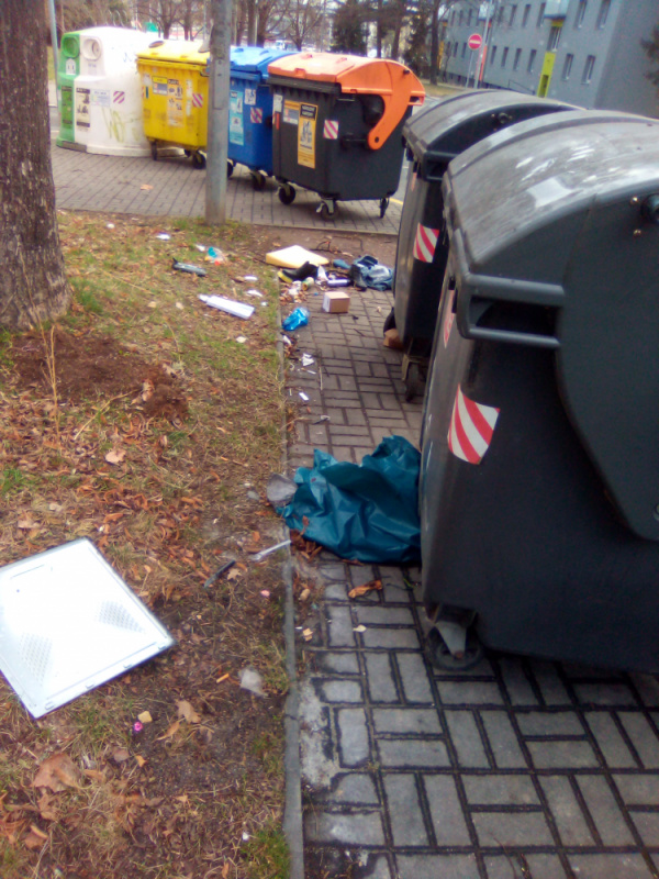 Prosím o úklid šíleného nepořádku u kontejnerů a před domem Pod Lipami 55 Děkuji.