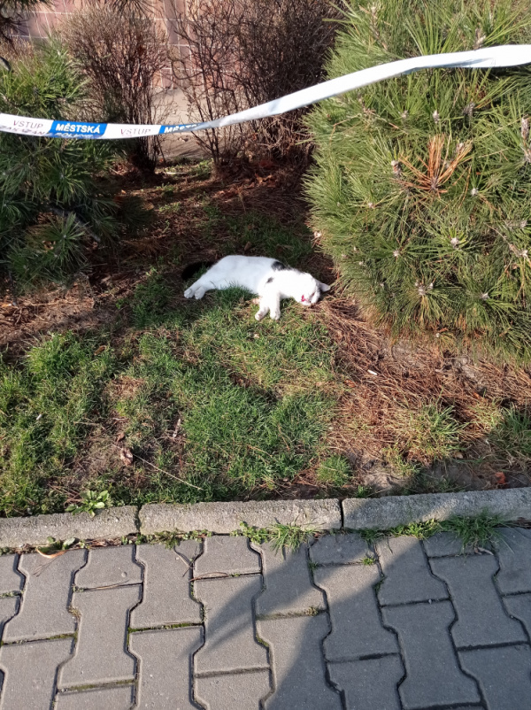 Mrtvá kočka u hotelu Olšanka vedle chodníku roh prokopovyaChelcickeho pod stromem