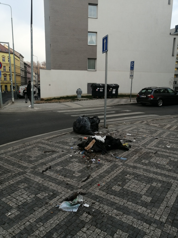 Odpad na ulicy pred skolkou - zacatek Jeseniove ul.