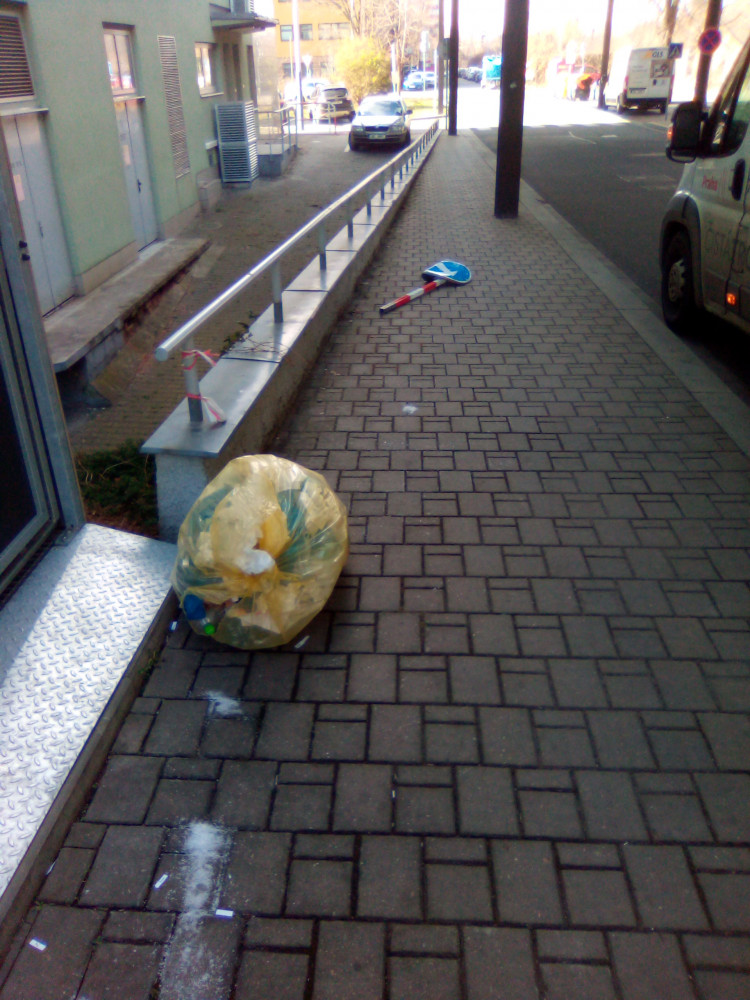 Pytel s odpadky a dopravní značka.