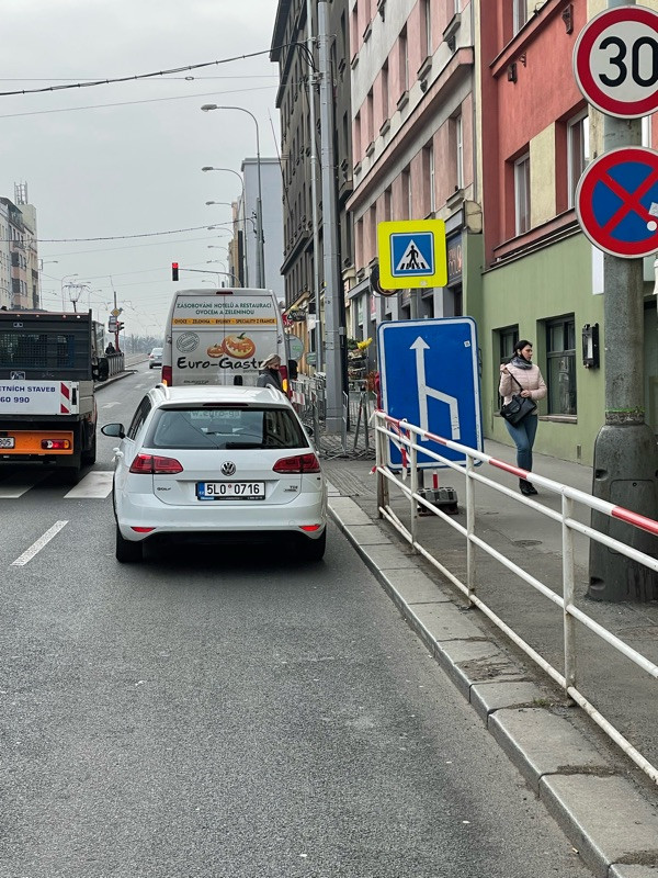 Znacka “zúžení do jednoho pruhu” těsně před přechodem. Naprosto nejsou vidět chodci, kteří by chtěli přecházet. A děti už vůbec ne!