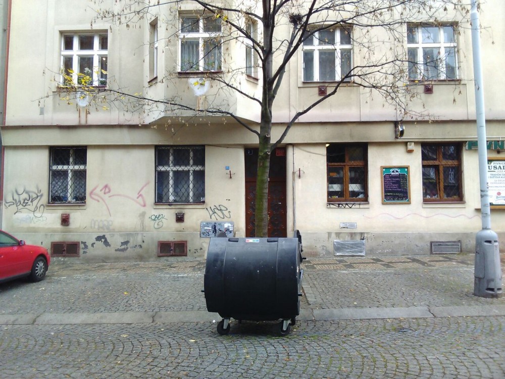 Velká postelová matrace vedle kontejneru na směsný odpad. Stav: neděle odpoledne.