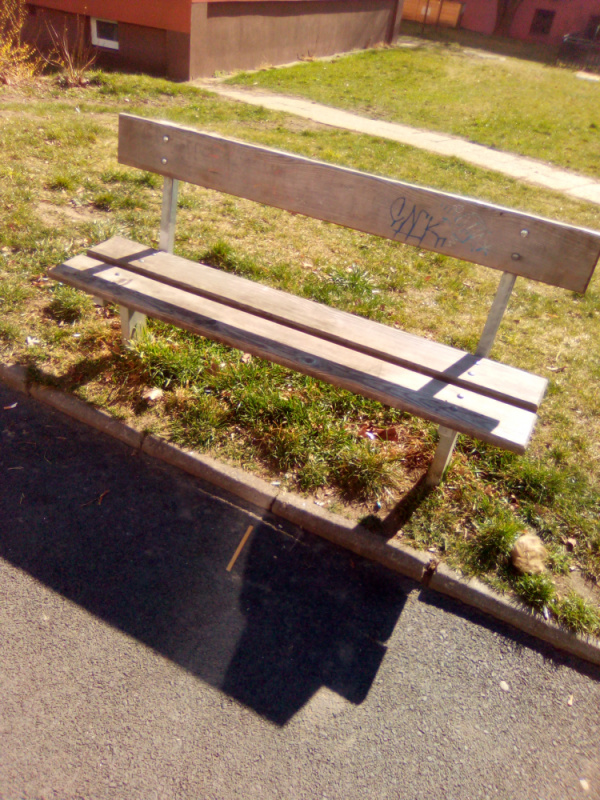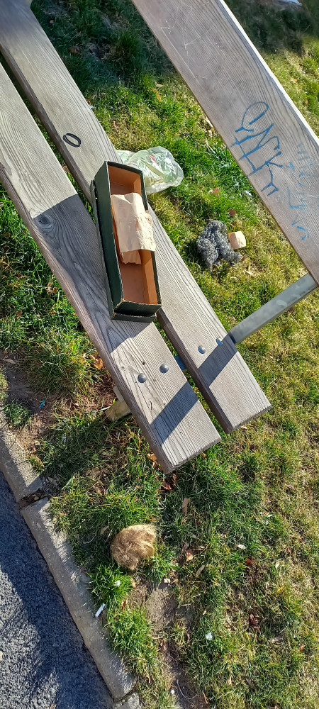 Nepořádek na v okoli lavičky mezi domy Na Vrcholu 8 a 10