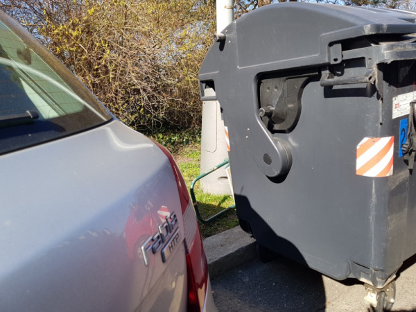 Nepořádek kolem kontejneru. Vyhozené štafle.Praha3, Kunešova 10.