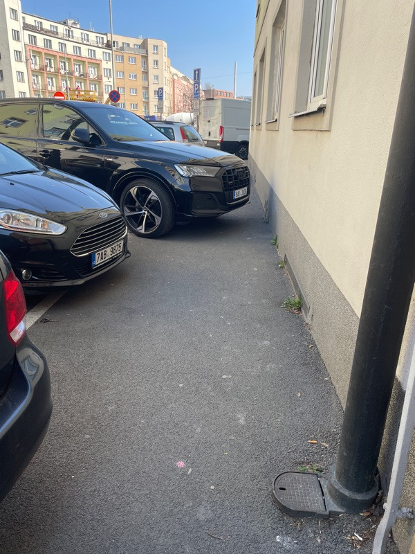 někdo tady parkuje silně hloupě. Chodník je neprůchozí.
