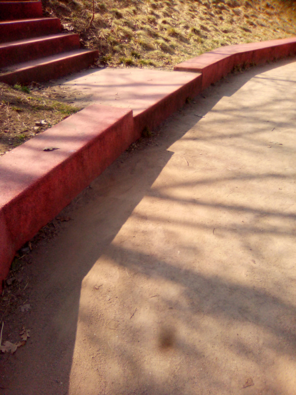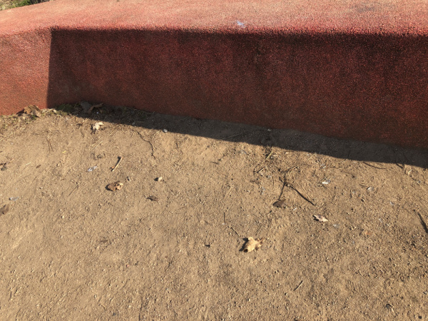 Střepy a sklo na dětském hřišti okolo červených ochozu u velkých schodů .