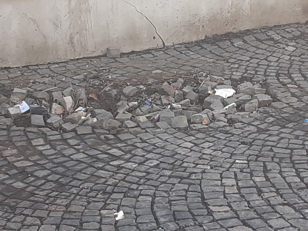 Na rohu ulic u popelnic je poškozená mozaika na chodníku...