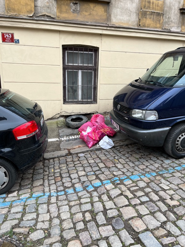Pytle s odpadem na chodniku v ulici Pod Vitkovem, jsou tu jiz nekolik dni.