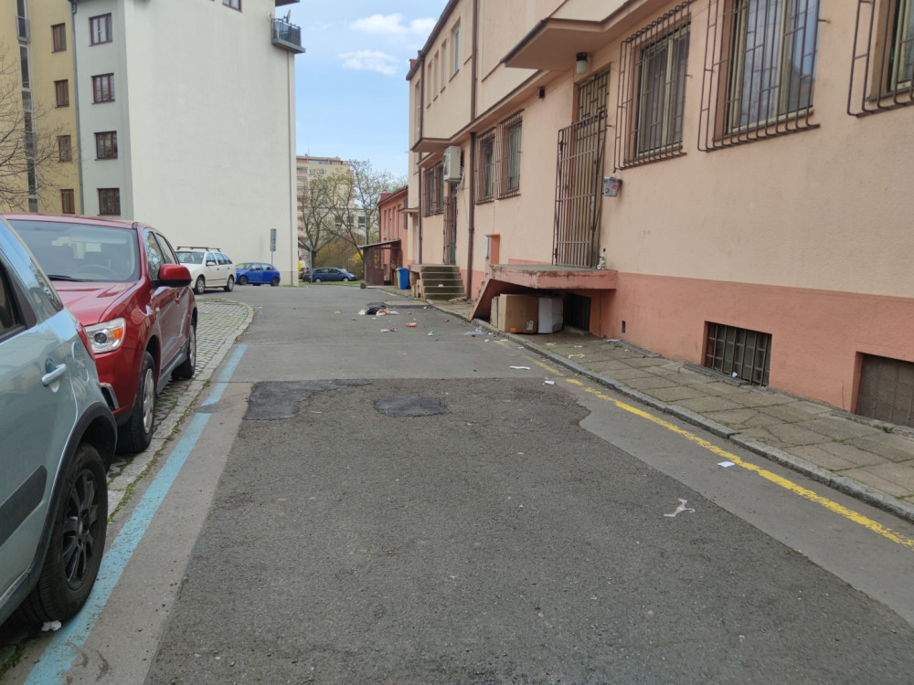 Bordel na konci ulice K Chmelnici a kolem, kam ho roznáší vítr. Plus je dost odpadu pohozeného kolem kontejneru na komunální odpad (není na fotkách)