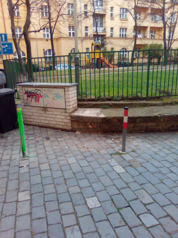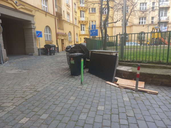 části nábytku před elektrickým zařízením u popelnic ve vnitrobloku