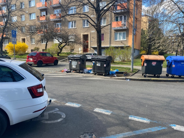 Dobrý den, děkujeme za Váš podnět. Za tento nepořádek odpovídá a je povinen ho uklidit vlastník kontejneru, kterým bude nejspíše majitel, či SVJ z nejbližšího domu... MČ-P3