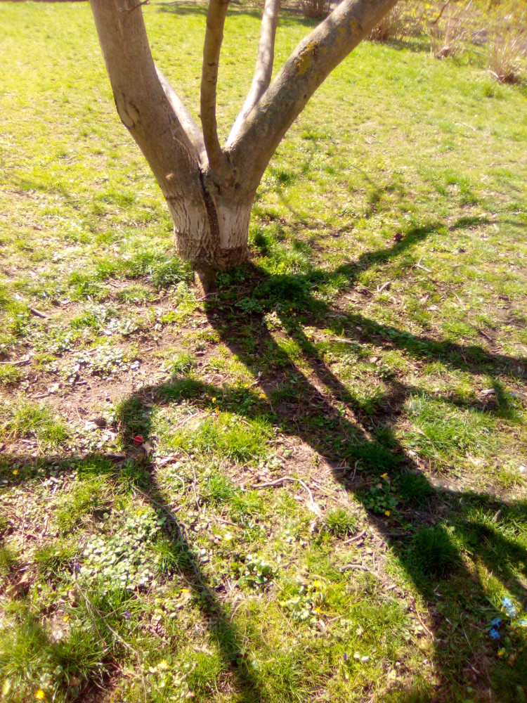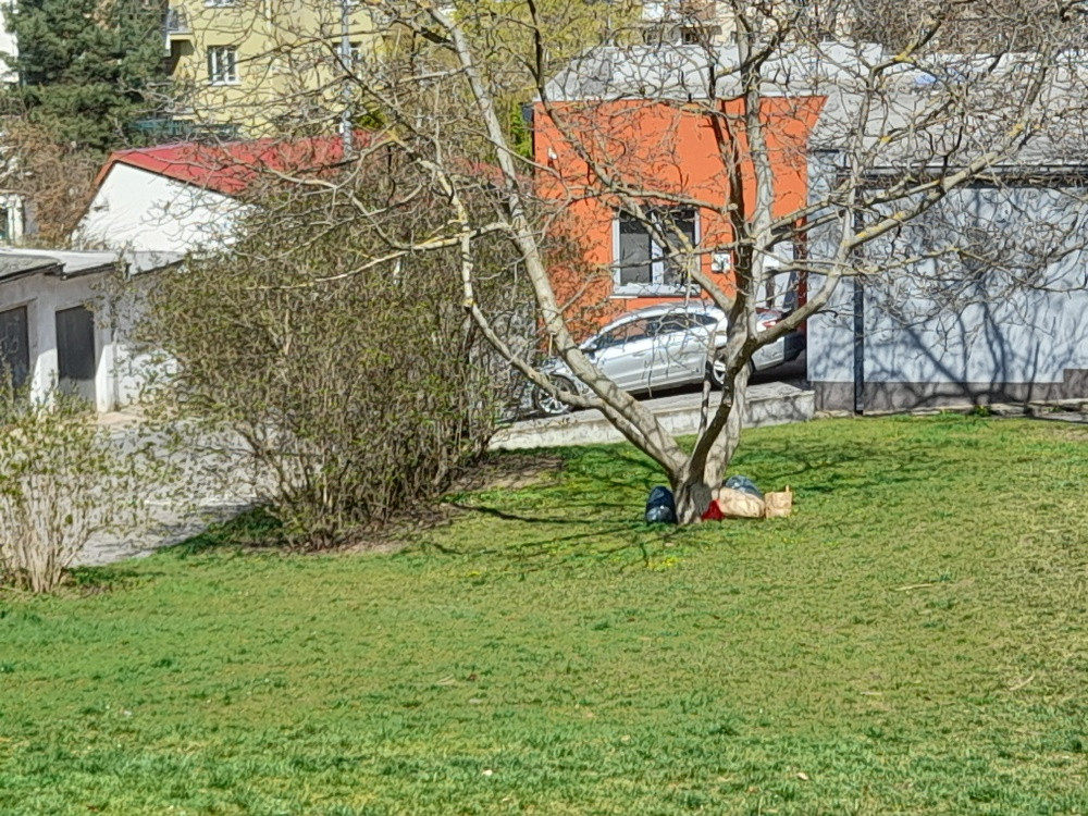 nějaké tašky v trávníku pod stromem mezi ulicemi Kriva X V Okruzi