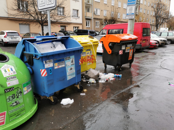 nepořádek okolo kontejnerů na tříděný odpad si řeší svozová firma AVE sama. Minimálně 1x za den jezdí od této firmy úklidová četa, která odstraní odpadky okolo popelnic.