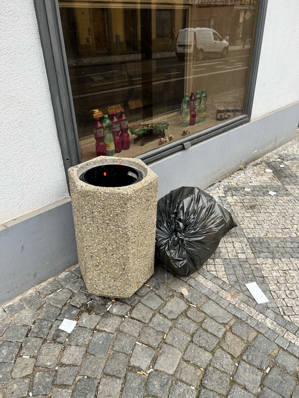 U odpadkového koše před řeznictvím je odhozený pytel s odpadky a kolem rozházené odpadky.