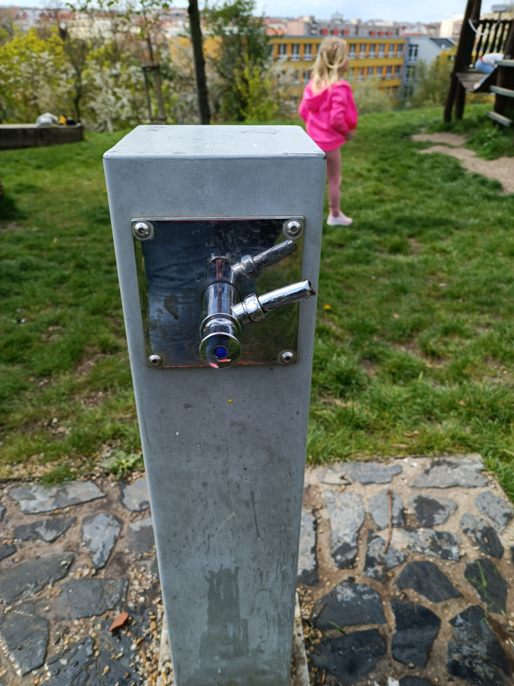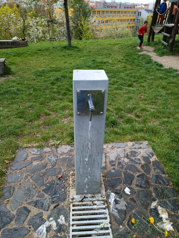Na Parukarce na hřišti s dřevěnými herními prvky, nad ZŠ Chelčického teče neustále voda z kohoutku u pítka. Podařilo se nám jen kohoutek natočit,aby voda netekla tolik.