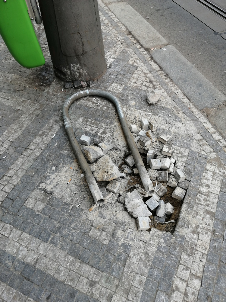 Cyklostojan vyrvaný že země. Seifertova 24 (Dookie)