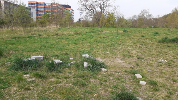 Pokus o popis místa, vjezd do parku od kontejnerů na tříděný odpad pod domem Pitterova 7, stále západně dozadu, zelené stany jsou v kotlině stromů. Jako WC samozřejmě slouží veřejný prostor.