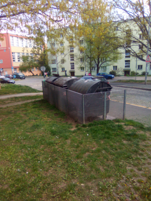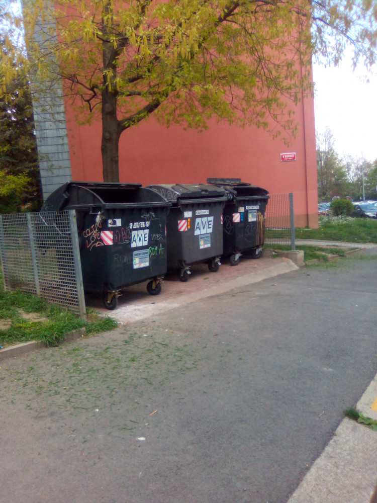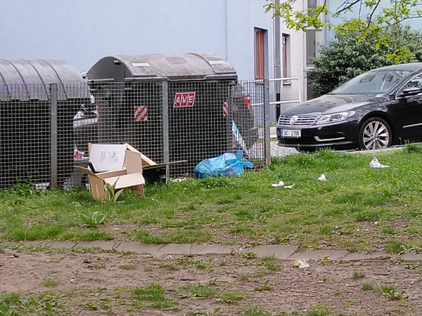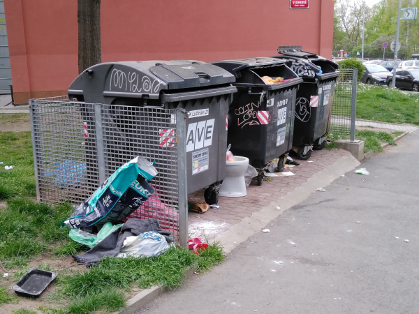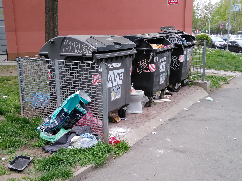 Odpadky i větší kusy, například WC mísa, u popelnic.