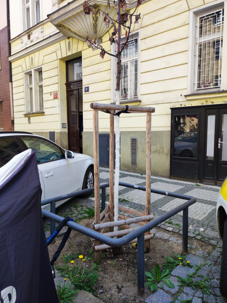 Suchý strom z nedávné výsadby. Potřeba vysadit nový. Přemyslovská 10