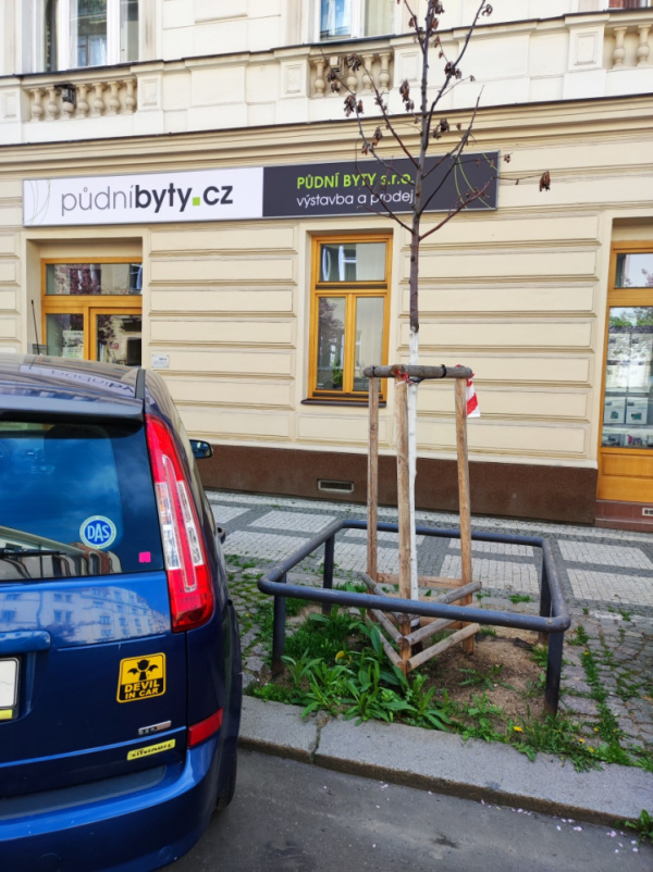 Suchý strom z nedávné výsadby. Potřeba vysadit nový. Přemyslovská 8