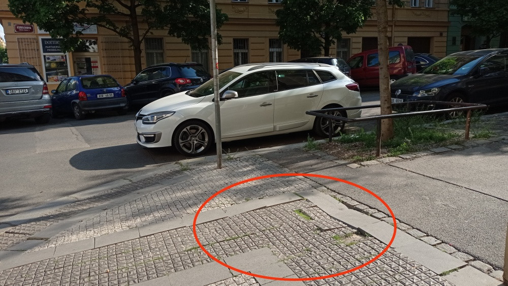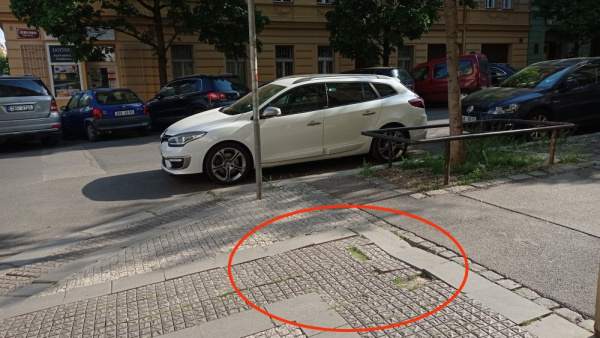 Na rohu ulic Kubelíkova a Bořivojova je naproti lampě číslo 300 735 poškozená/rozpadlá a viklající se dlažba chodníku.